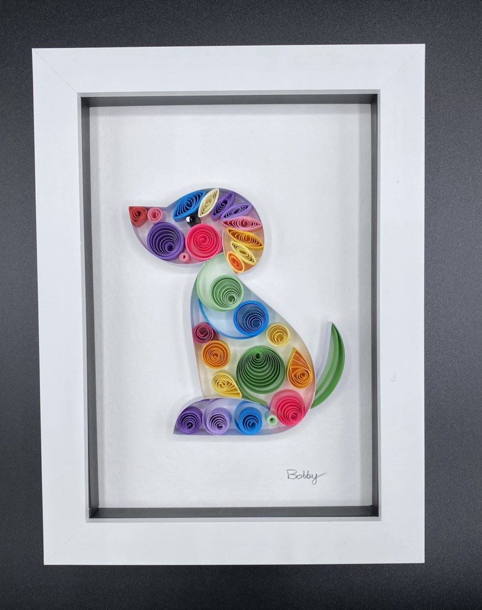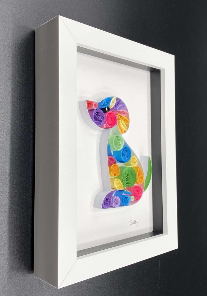 Each picture is a true labour of love which takes many hours to complete. Colourful card is individually cut into strips which are then formed into scrolls and shapes to bring the picture to life. As light picks up the graduating shades and pops of vibrant colour the pictures give the illusion of movement when viewed from different angles.